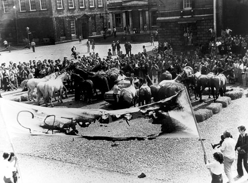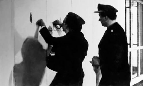 Proceso a la realidad (Museo de Arte Moderno, 1973), en la que, sobre un muro cubierto con pósters y graffitis, se lee la consigna “Ezeiza es Trelew”