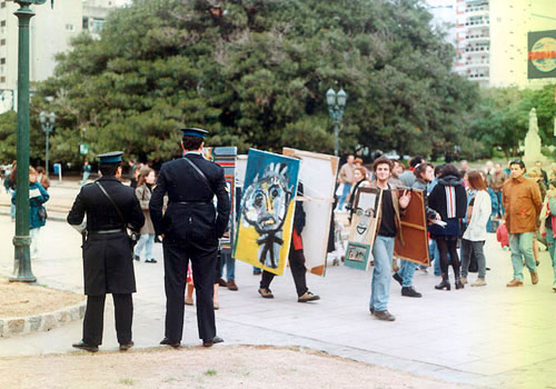 No obstante, muchos artistas todavía se sienten relegados de ese circuito, o se autoexcluyen por considerarlo viciado o sobredeterminado. La resistencia de los espacios institucionales y del mercado del arte a la producción emergente es el núcleo de algunas acciones de esos años. En 1994, un grupo de jóvenes decide transformarse en el soporte físico de sus propias pinturas y sale a la calle portándolas a la manera de “hombres-sándwich”. Con una obra adelante y otra detrás, realizan caminatas por diferentes puntos de la ciudad exhibiendo su trabajo, creando un espacio propio y, al mismo tiempo, generando un circuito de circulación alternativo para un público casual y no especializado.