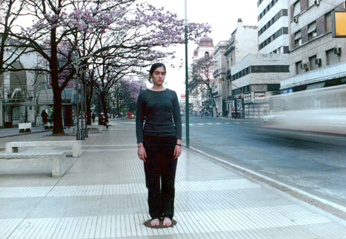 Esa misma estructuración social de roles reaparece en otras performances que cuestionan la construcción acrítica de estereotipos y géneros. El 8 de marzo de 2000, Zoe Di Rienzo realiza una maratón alrededor de la Mujer urbana (una escultura pública de Antonio Seguí emplazada en una rotonda de la ciudad de Córdoba) con motivo de la celebración del “día de la mujer”. Vestida de rosa, con anteojos oscuros, una canasta de rosas rojas y un cortejo de globos blancos, la artista rodea la escultura saludando a los automovilistas, con una felicitación a las mujeres y un toque de bocina a los hombres. La ridícula caracterización replica la grotesca figura escultórica, al tiempo que resalta la insensatez del festejo, basado en una imagen igualmente estereotipada de la condición femenina.