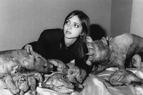 La primera versión de esta performance gastronómica tiene lugar en Rosario, en el Museo Juan B. Castagnino en mayo de 1993. Nicola es invitada por el director, aunque resistida por la Asociación Amigos del Museo. El acontecimiento casi se suspende por llamadas anónimas y amenazas. Su comienzo anunciado para las 20, recién se concreta hacia las 23, luego de la intervención de la brigada de explosivos en búsqueda de una bomba que nunca existió. Una cama de agua, sábanas de raso rosa, una porchetta rodeada de doce pollos al spiedo constituyen el núcleo central de la acción. “Fue una verdadera orgía gastronómica, la gente no comía: ‘morfaba’ con las manos”, recuerda Nicola. Por esa época los cines proyectaban films como El cocinero, el ladrón, su mujer y su amante (Peter Greenaway, 1989), o La Fiesta de Babette (Isak Dinesen, 1987), donde una dama francesa venida a menos que trabaja como sirvienta, gana la lotería y gasta íntegramente el premio en un gran banquete para sus patronos y vecinos. Nicola piensa diferente: “Yo lo hago para mí, no me importa si el otro lo aprecia, hago lo que amo. Junto al placer de comer, el rito del banquete comunitario tiene algo de macabro, hay un espíritu festivo alrededor de un cadáver. El chancho se sirve entero en la mesa, cabeza, rabo, hasta la piel”. Para Nicola, el cerdo es “ante todo, la posibilidad física de poder manipular a mi antojo un mamífero de buen tamaño; también sé que encarna ciertos aspectos negativos, es un animal sucio, cuya carne es prohibida por judíos y musulmanes; en el argot popular hacer el amor es también “la chanchada”, la “porquería”.