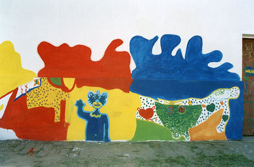 Sin título, 2004, pintura acrílica para exteriores. Paredes exteriores de la Escuela Nº 3 Mariano Moreno, Alem y Av. Alte. Brown, Los Toldos, Provincia de Buenos Aires.