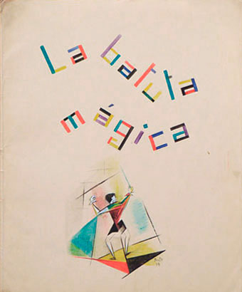 Esta última tipología se aprecia también en el modo que Yente eligió para elaborar las ilustraciones de su libro La batuta mágica, también de ese año. En él –una réplica al Aprendiz de brujo de Dukas, creada bajo la impresión que le causara la actuación del precoz director de orquesta Pierino Gamba– utilizó triángulos y trapezoides para construir tanto a los personajes –el mago y el niño– como los escenarios –el castillo– y la parafernalia involucrada en las escenas de encantamiento. Algunos detalles más explícitamente figurativos completan la fisonomía del protagonista, pero en general todo está resuelto con estos limitados recursos, sin embargo ricos en sugerencia de movimiento y variedad cromática.