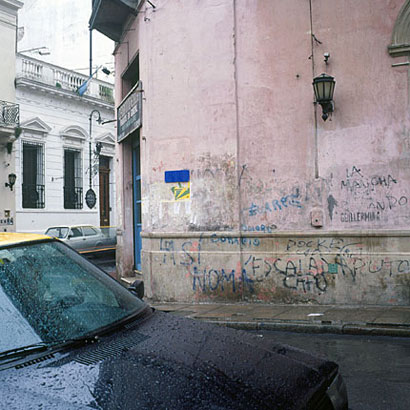 Las dos versiones de Interferencia urbana (Ginebra, 1994; Buenos Aires, 2002) vinculan vivencias. Los carteles señalizadores de calles, cuyo propósito es la orientación, actúan como nexo: tienen en casi todas partes un formato similar. La ausencia de nombres contradice su función y a la vez los presenta como ambiguo signo de globalización. Por otro lado, un video propone un vertiginoso recorrido ferroviario, conducido por el lanzamiento conjetural de una pelota de una estación a otra.